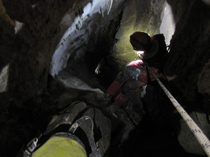 Saliamo fino all’ingresso grazie al solito GPS che ci guida. Ci cambiamo ed entriamo dritti fino al pozzo; aggiungiamo un fix, cambiamo corda e arriviamo velocemente al fondo. Roberto senza saperlo parte in esplorazione (ci eravamo fermati qualche metro più in su, senza corda…) ma purtroppo si ferma davanti ad un meandro stretto, pieno zeppo di concrezioni.